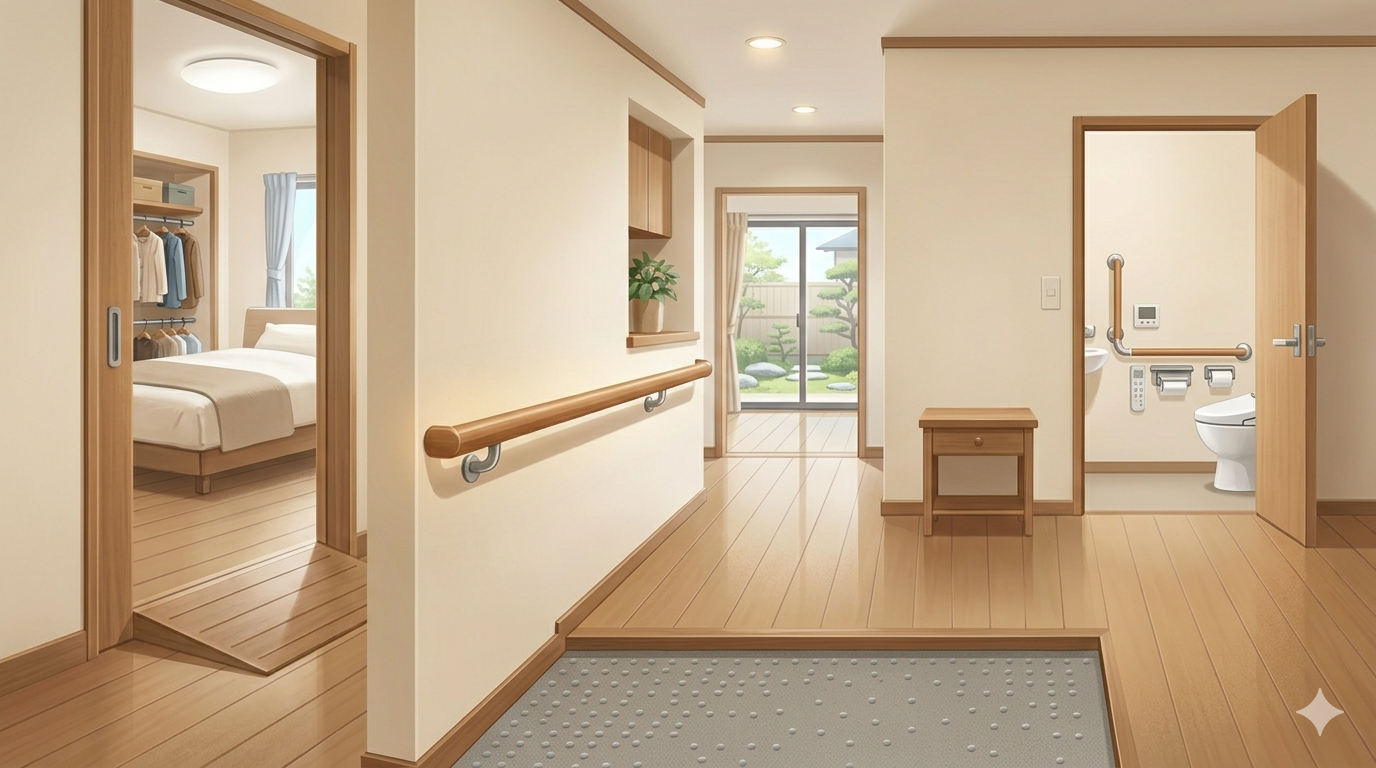 手すりの取付、段差解消、滑り止め防止、トイレ改修など。ケアマネジャー様とも連携し、申請から施工までサポートします。